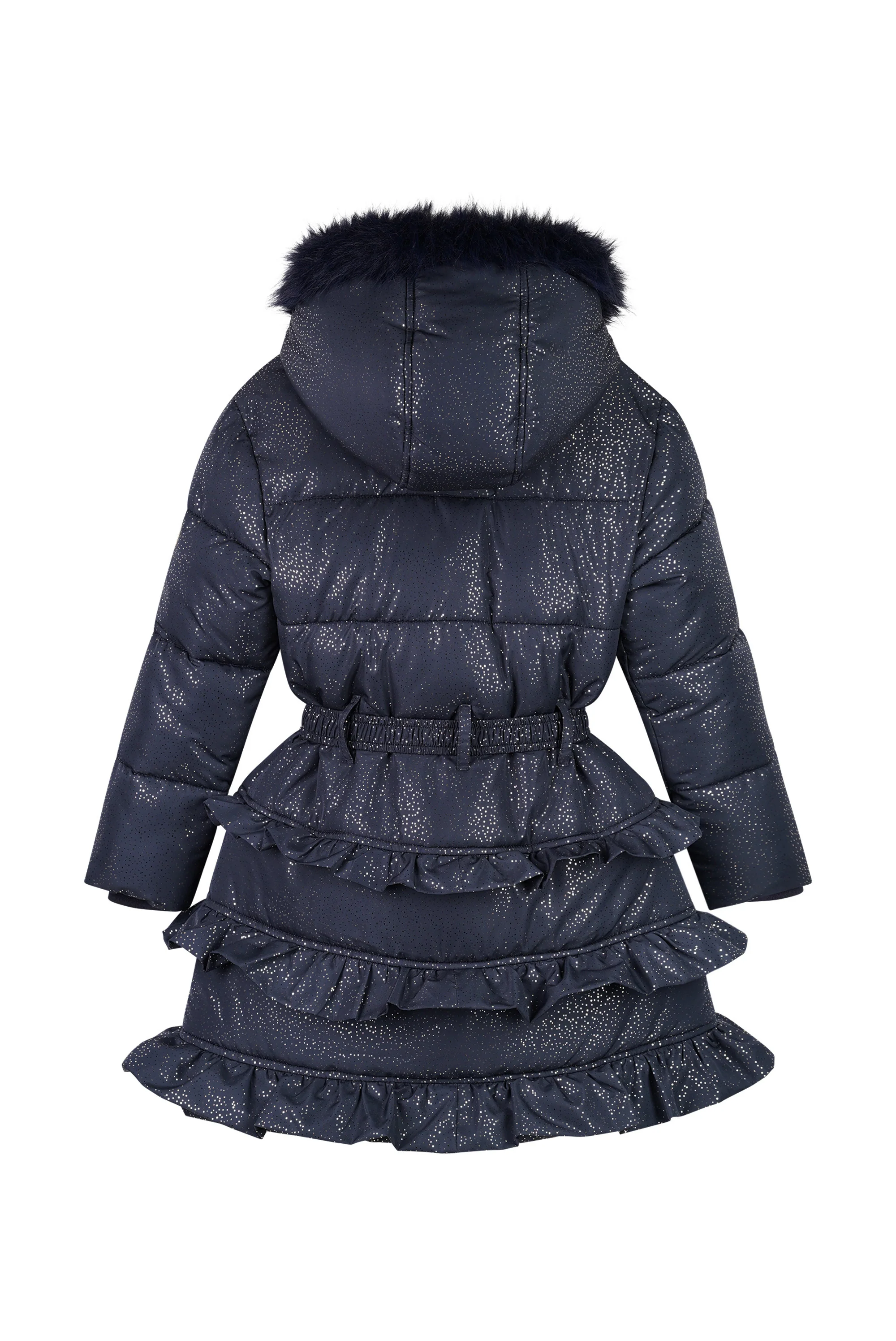 Deze stijlvolle winterjas in de kleur Donkerblauw is een echte eyecatcher dankzij de speelse ruches en subtiele glitterafwerking. De jas heeft een warme voering en een capuchon, waardoor je kind goed beschermd is tegen kou en wind. De langere pasvorm en praktische zakken zorgen voor extra comfort en functionaliteit tijdens koude dagen.