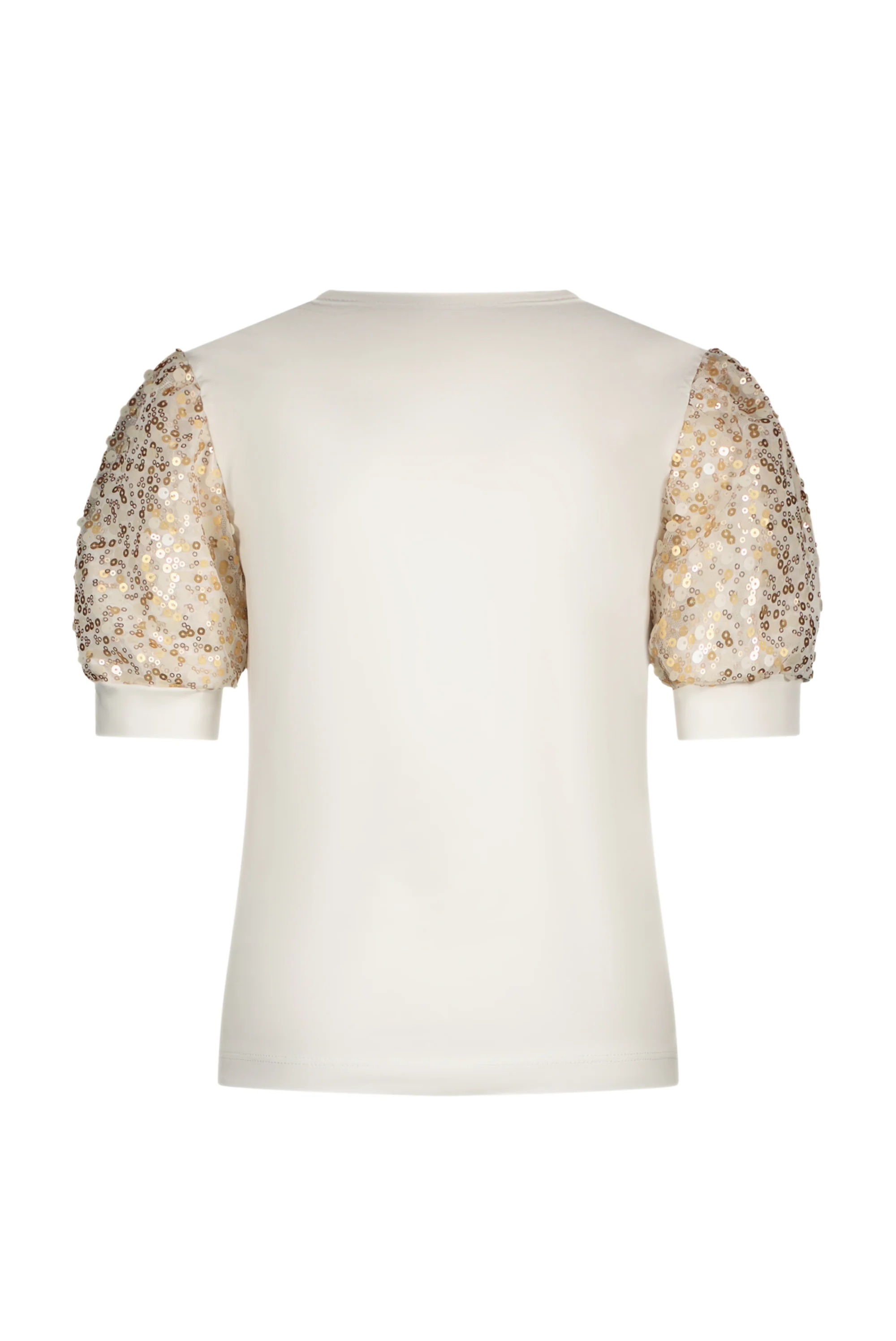 Dit meisjes T-shirt in de kleur Off White is een stijlvolle en comfortabele basic met een speelse twist. Het shirt is uitgevoerd in een zachte katoenmix en voorzien van subtiele pailletten details, wat zorgt voor een leuke en trendy uitstraling. Perfect voor zowel dagelijks gebruik als een iets feestelijkere look.